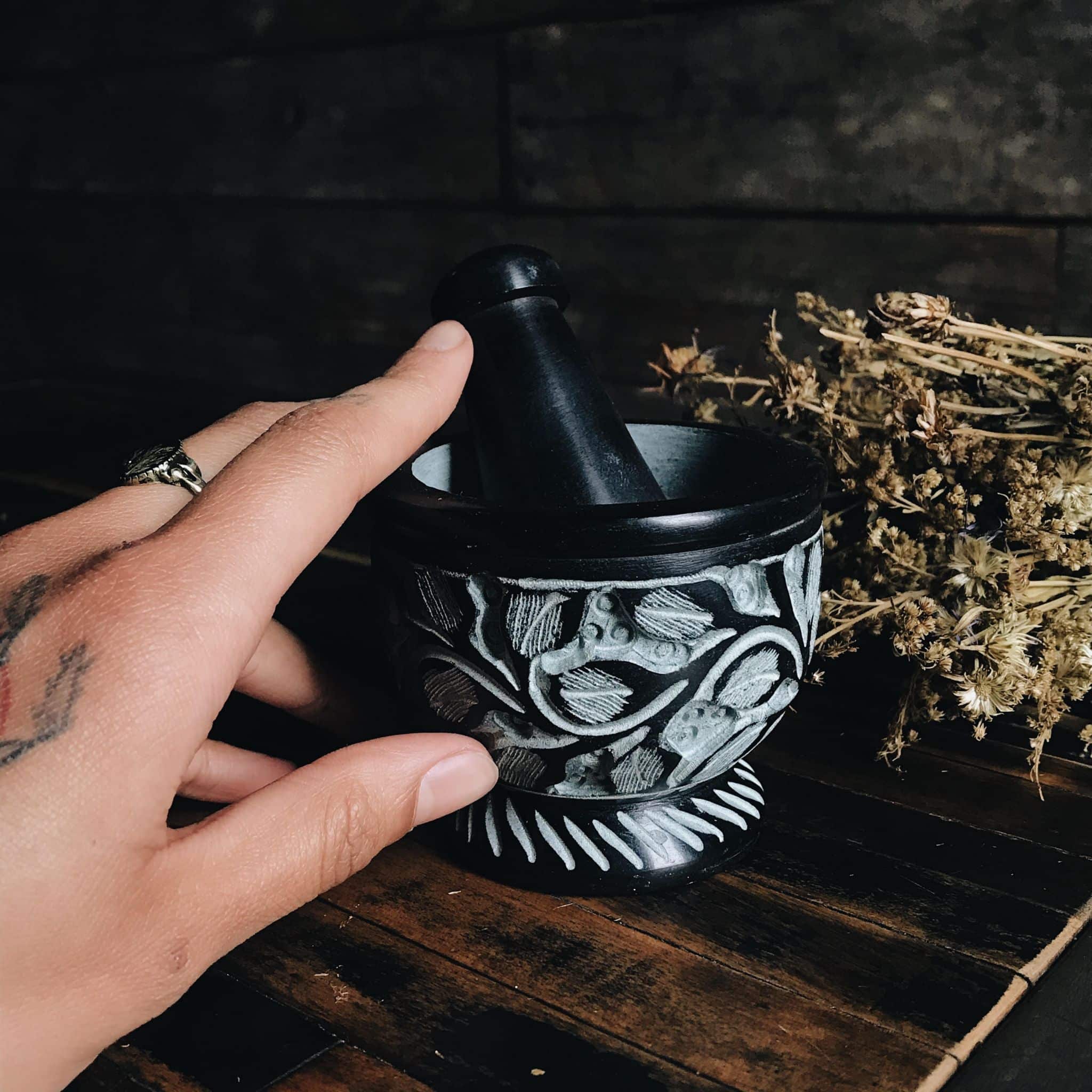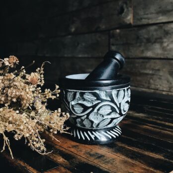 Beautiful soapstone mortar & pestle. Perfect tool for hand grinding herbs and resins. Use to make your favourite incense blend or to press your herbs with intention. Beautifully crafted piece.