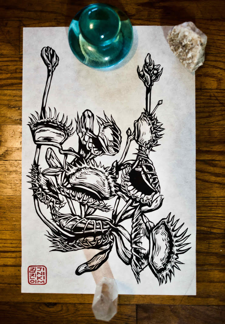 linocut/woodcut prints encompassing nature, ritualistic practices, and hidden critters.