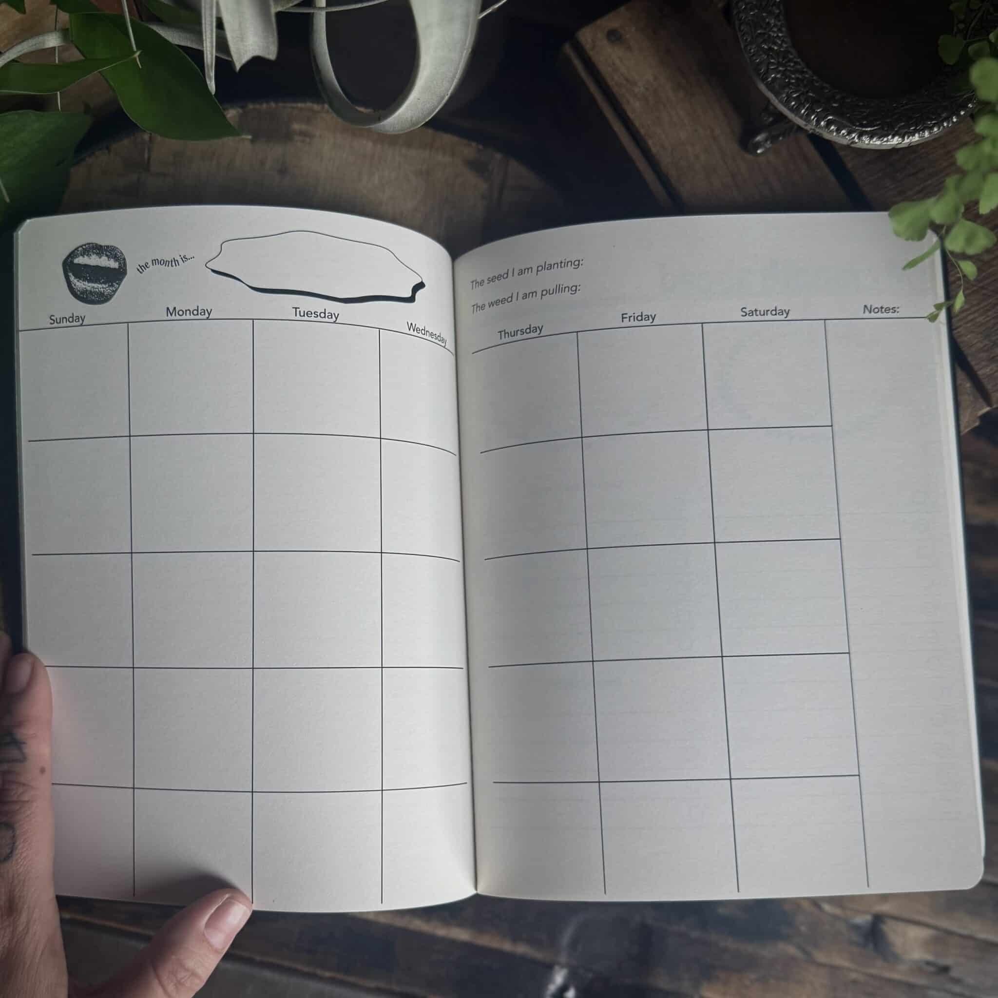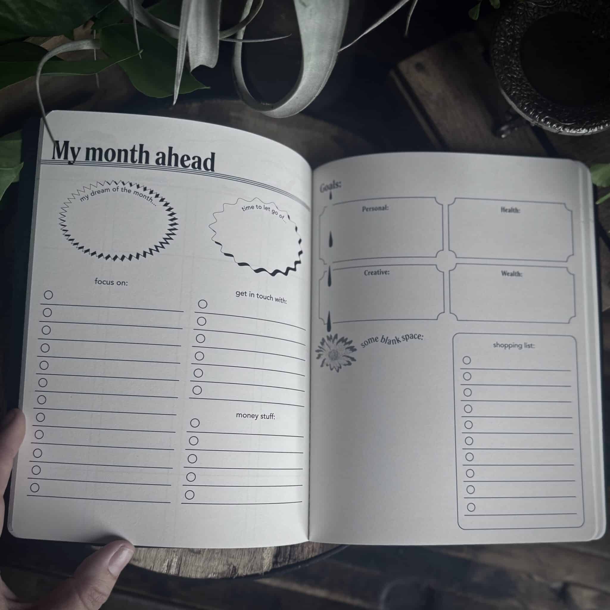 An open dated planner where you can write in the dates as you go. This style offers a blank monthly view calendar, a full spread of structured lists where you can keep track of important tasks for the month, plus a spread of dotted note pages per month. These are great for the folks who don’t need to structure their days, but do like to keep track of the bigger things coming up.