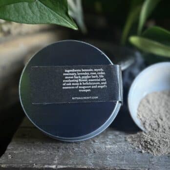 Ingredients: benzoin, myrrh, rosemary, lavender, rose, cedar, storax bark, poplar bark, life everlasting flower, oak moss & helichrysum essential oils, and essence of mugwort and angel’s trumpet.