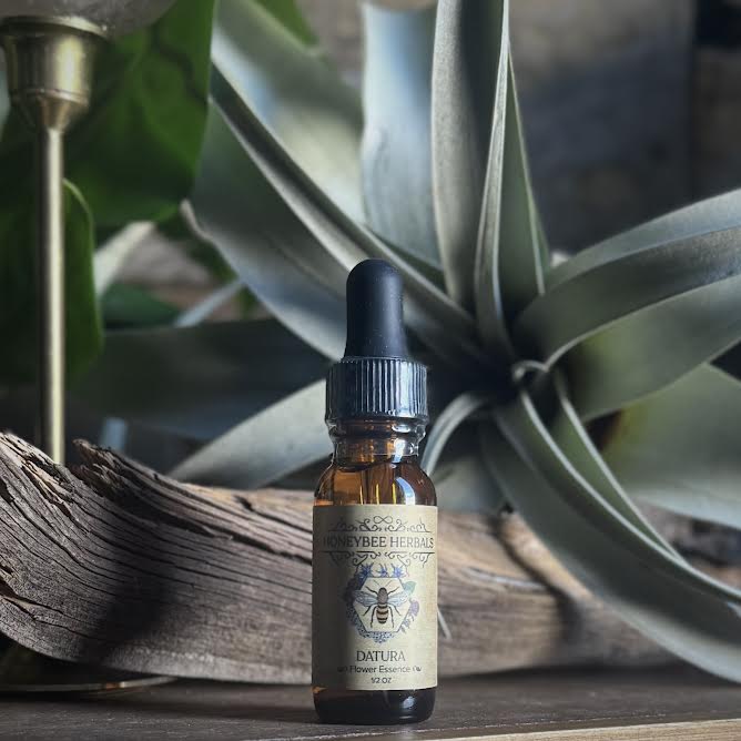 Datura -Datura is an incredibly powerful plant which facilitates the cycles of death & rebirth within our lives. Datura supports us in times of change, initiation, & deep personal transformation. Datura helps us to see the truth in front of us cutting through deception and illusion. This plant helps us to let go of that which no longer serves us making space for the new, helping us to give death to what needs to symbolically die within our lives. This essence was made on a full moon in our garden. Ingredients: *Datura Flowers, Organic Cane Alcohol, & Spring Water.